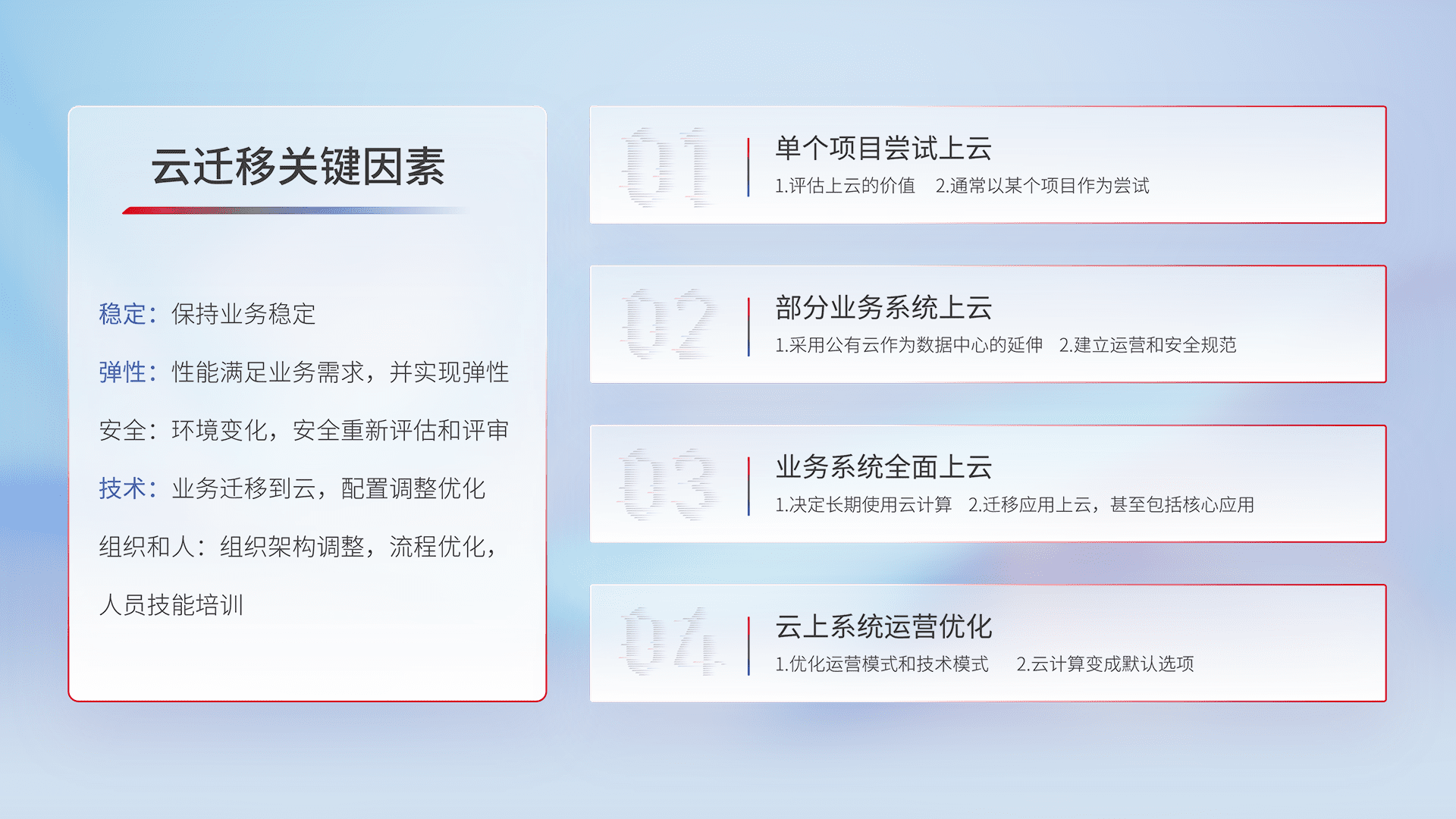 结合实际业务,,从规划设计、、、云平台选型、、云原生改造、、、、数据迁移、、、集成交付,,,,迁移全过程为客户识别最佳上云路径,,,做好风险识别管理,,,设计网络架构、、身份权限、、、安全审计合规、、、操作审计、、、日志审计、、、、监控告警策略、、多站点容灾设计等,,,,对云上基础设施进行整体规划,,,,提升IT治理水平,,,,以满足弹性、、高可用、、、、高性能的需求。。
