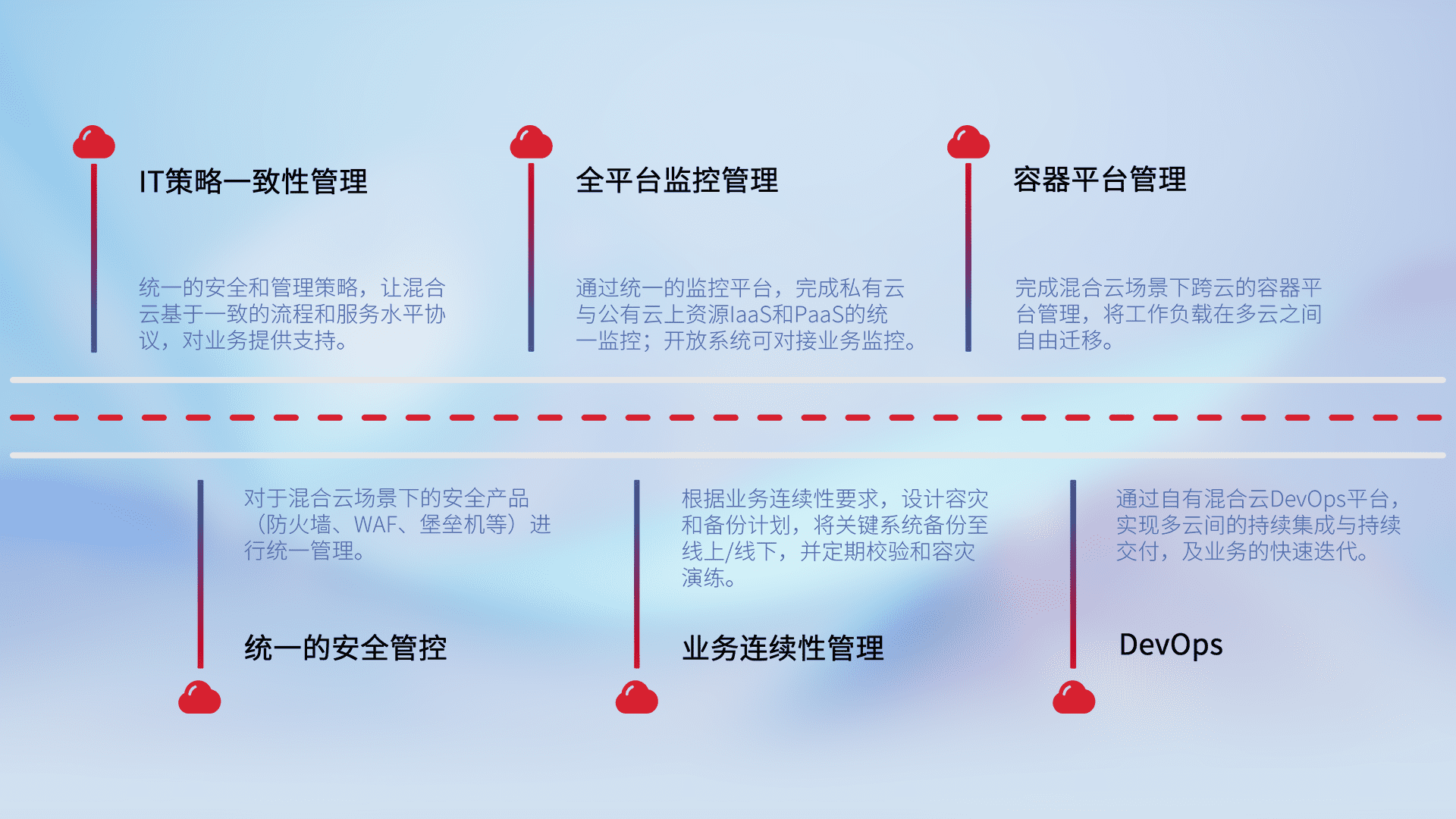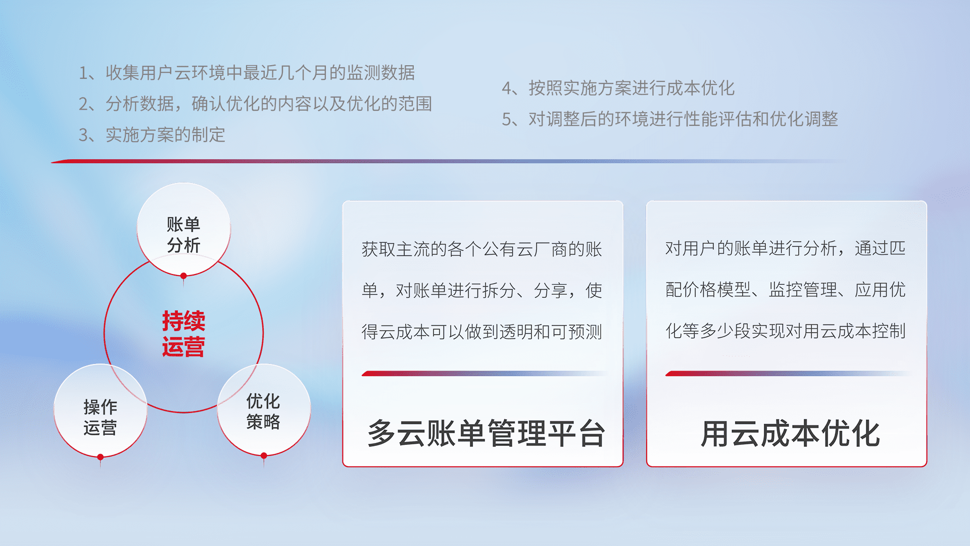 通过多云纳管,,,以统一的资源数据模型把客户的云资源进行抽象和封装,,,,进而实现对多云资源的统一操作,,,,保障云资源管理的可靠性、、、稳定性与可用性。。。。量身定制化运维内容,,配置、、开发运维、、补丁管理、、备份、、、、监控、、、、认证和访问管理、、审计和日常巡检等,,保障在用云过程中的可靠度,,,稳定度以及高可用率。。。。